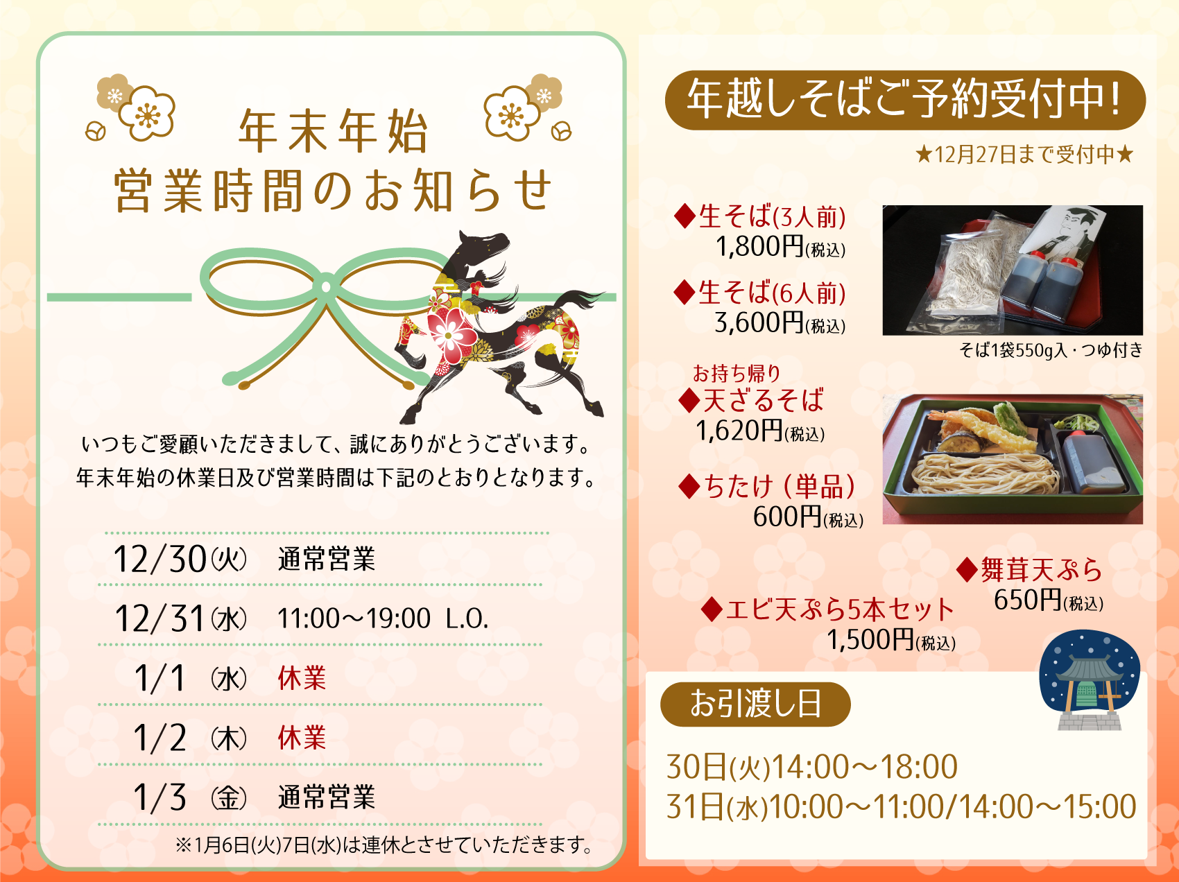 手打そば・寿司・和食処『ちづか』 2025.12.19 2020.12.01 新着情報 2025年12月16日 NEW! 今年も「ちづか」の年越しそば、承ります。 2025年7月24日 【復旧済み】電話回線障害のお知らせ 2025年4月30日 初夏の栃木旅に — 手打ちそばと旬の味覚を 2025年4月2日 ちづかのスイートポテト ちづか お食事メニュー 法事料理などもございます。詳細はお問い合わせください。